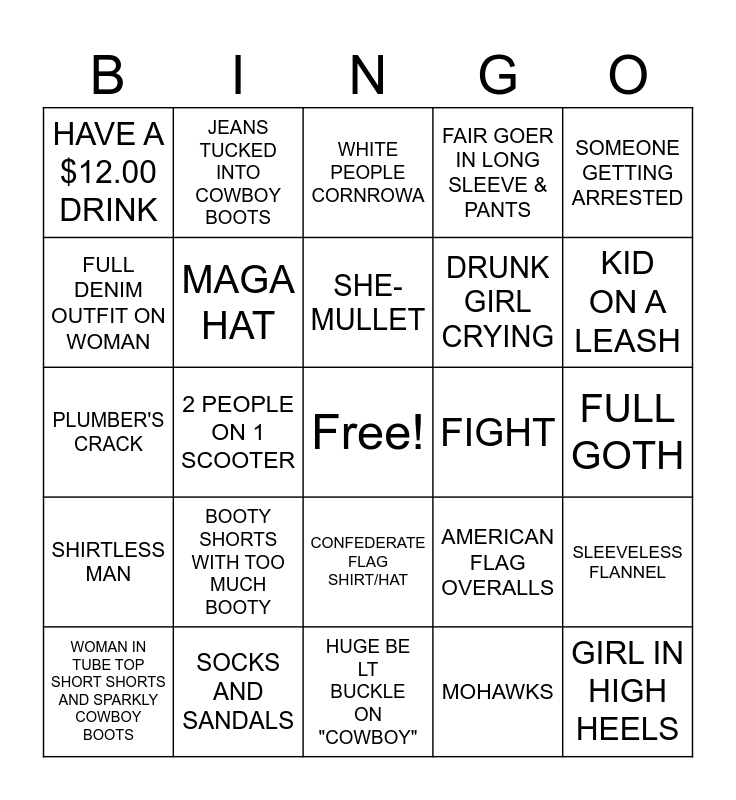 This bingo card has a free space and 24 words: BOOTY SHORTS WITH TOO MUCH BOOTY, SOCKS AND SANDALS, SHE-MULLET, WOMAN IN TUBE TOP SHORT SHORTS AND SPARKLY COWBOY BOOTS, SOMEONE GETTING ARRESTED, HAVE A $12.00 DRINK, FULL DENIM OUTFIT ON WOMAN, JEANS TUCKED INTO COWBOY BOOTS, FIGHT, CONFEDERATE FLAG SHIRT/HAT, DRUNK GIRL CRYING, PLUMBER'S CRACK, AMERICAN FLAG OVERALLS, SLEEVELESS FLANNEL, MAGA HAT, MOHAWKS, FULL GOTH, WHITE PEOPLE CORNROWA, KID ON A LEASH, 2 PEOPLE ON 1 SCOOTER, GIRL IN HIGH HEELS, SHIRTLESS MAN, FAIR GOER IN LONG SLEEVE & PANTS and HUGE BELT BUCKLE ON "COWBOY".
