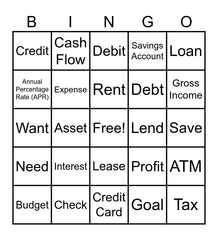 This bingo card has a free space and 29 words: Budget, Career, Asset, Cash, Credit, Debit, Expense, Interest, Lend, Check, Save, Tax, Credit Card, Goal, Gross Income, Invest, Lease, Need, Loan, Want, Profit, Net Worth, Debt, Annual Percentage Rate (APR), Savings Account, Cash Flow, ATM, Rent and Social Security.