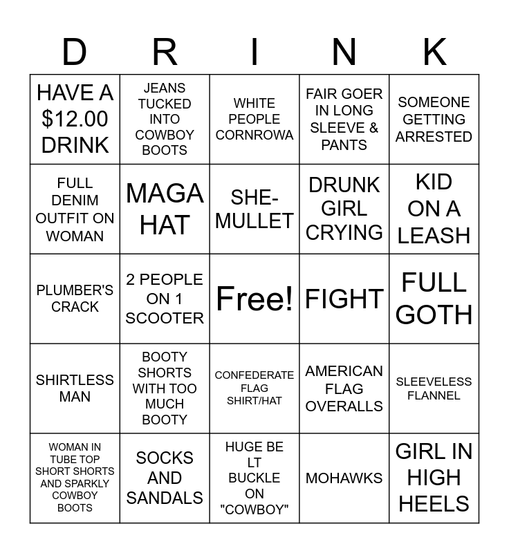 This bingo card has a free space and 24 words: BOOTY SHORTS WITH TOO MUCH BOOTY, SOCKS AND SANDALS, SHE-MULLET, WOMAN IN TUBE TOP SHORT SHORTS AND SPARKLY COWBOY BOOTS, SOMEONE GETTING ARRESTED, HAVE A $12.00 DRINK, FULL DENIM OUTFIT ON WOMAN, JEANS TUCKED INTO COWBOY BOOTS, FIGHT, CONFEDERATE FLAG SHIRT/HAT, DRUNK GIRL CRYING, PLUMBER'S CRACK, AMERICAN FLAG OVERALLS, SLEEVELESS FLANNEL, MAGA HAT, MOHAWKS, FULL GOTH, WHITE PEOPLE CORNROWA, KID ON A LEASH, 2 PEOPLE ON 1 SCOOTER, GIRL IN HIGH HEELS, SHIRTLESS MAN, FAIR GOER IN LONG SLEEVE & PANTS and HUGE BELT BUCKLE ON "COWBOY".