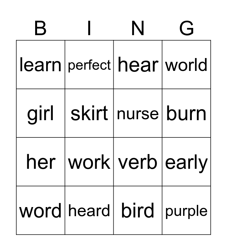 This bingo card has 16 words: heard, early, hear, learn, her, perfect, verb, bird, girl, skirt, word, world, work, burn, nurse and purple.