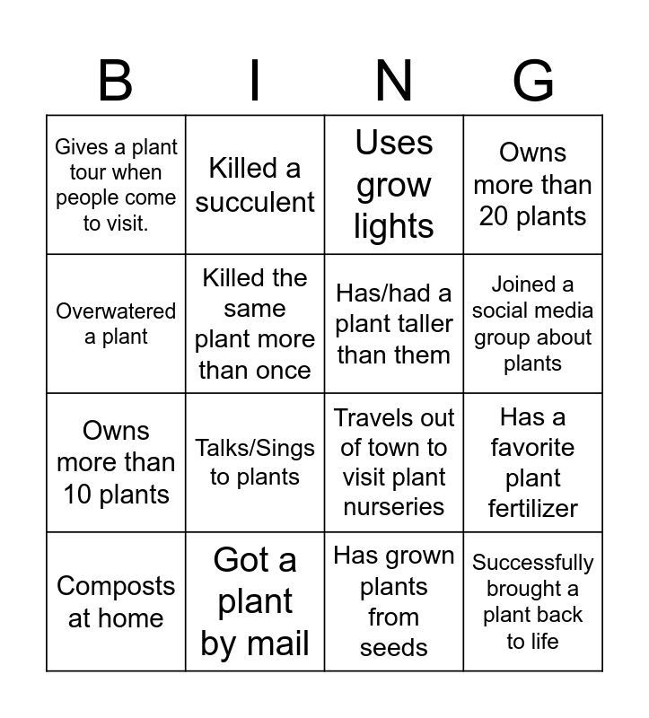 This bingo card has 27 words: Purchased a plant, but never planted it, Fought off pests, Owns more than 10 plants, Successfully propagated a plant, Killed the same plant more than once, Uses grow lights, Killed a succulent, Successfully brought a plant back to life, Got a plant by mail, Shares plant pics, Travels out of town to visit plant nurseries, Owns more than 20 plants, Touched a cactus, Follows a watering schedule, Talks/Sings to plants, Has a favorite plant, Has/had a plant taller than them, Joined a social media group about plants, Has a greenhouse, Gives a plant tour when people come to visit., Has grown plants from seeds, Uses moss poles to support plants, Has a favorite plant fertilizer, Composts at home, Knows the difference between annuals and perennials, Overwatered a plant and Names their plants.