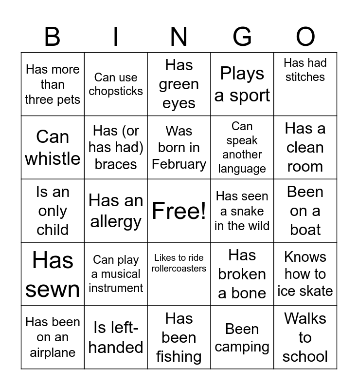 This bingo card has a free space and 24 words: Can play a musical instrument, Is left-handed, Was born in February, Has been on an airplane, Has had stitches, Has more than three pets, Can whistle, Can use chopsticks, Has seen a snake in the wild, Likes to ride rollercoasters, Can speak another language, Is an only child, Has broken a bone, Knows how to ice skate, Has (or has had) braces, Been camping, Been on a boat, Has green eyes, Has a clean room, Has an allergy, Walks to school, Has sewn, Plays a sport and Has been fishing.