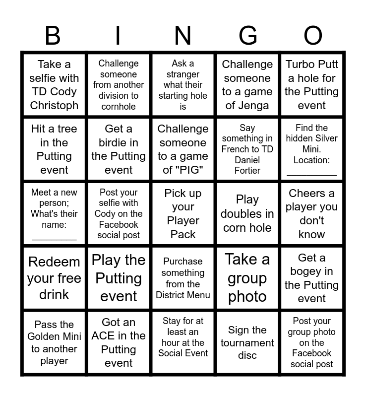 This bingo card has a free space and 24 words: Play the Putting event, Got an ACE in the Putting event, Challenge someone to a game of "PIG", Pass the Golden Mini to another player, Turbo Putt a hole for the Putting event, Take a selfie with TD Cody Christoph, Hit a tree in the Putting event, Challenge someone from another division to cornhole, Play doubles in corn hole, Purchase something from the District Menu, Say something in French to TD Daniel Fortier, Meet a new person; What's their name: _________, Take a group photo, Get a bogey in the Putting event, Get a birdie in the Putting event, Sign the tournament disc, Cheers a player you don't know, Ask a stranger what their starting hole is, Find the hidden Silver Mini. Location: __________, Post your selfie with Cody on the Facebook social post, Post your group photo on the Facebook social post, Redeem your free drink, Challenge someone to a game of Jenga and Stay for at least an hour at the Social Event.