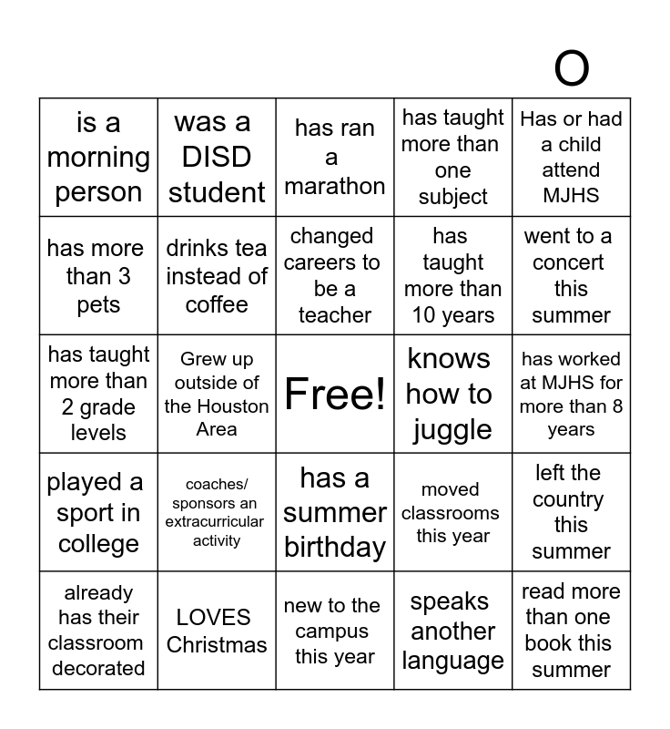 This bingo card has a free space and 28 words: left the country this summer, had a big life event this summer, has taught more than 10 years, speaks another language, has more than 3 pets, has ran a marathon, was a DISD student, played a sport in college, knows how to juggle, already has their classroom decorated, has taught more than 2 grade levels, has taught more than one subject, LOVES Christmas, new to the campus this year, went to a concert this summer, prefers paper over digital planners, coaches/ sponsors an extracurricular activity, drinks tea instead of coffee, changed careers to be a teacher, has a summer birthday, is a morning person, drives more than 20 minutes to work, read more than one book this summer, Grew up outside of the Houston Area, has worked at MJHS for more than 8 years, moved classrooms this year, Has or had a child attend MJHS and went to college far away from the Houston area.