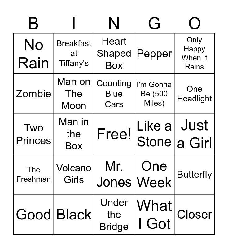This bingo card has a free space and 30 words: Black, Glycerine, Man in the Box, Black Hole Sun, No Rain, Heart Shaped Box, Man on The Moon, Mr. Jones, Like a Stone, Under the Bridge, Just a Girl, Closer, What I Got, Tonight, Tonight, One Headlight, Loser, One Week, The Freshman, Volcano Girls, Only Happy When It Rains, Two Princes, Short Skirt/Long Jacket, Breakfast at Tiffany's, I'm Gonna Be (500 Miles), Zombie, Pepper, Butterfly, Good, Counting Blue Cars and Hey Jealousy.