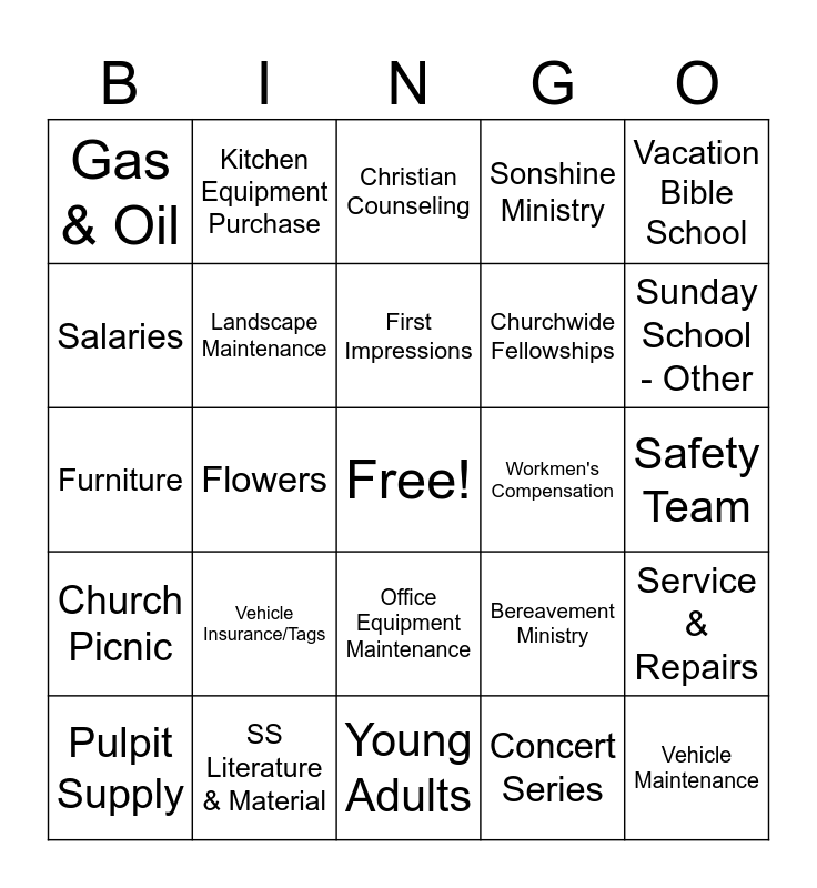 This bingo card has a free space and 115 words: Cooperative Program, Associational Missions, Connie Maxwell Home, Direct Missions, Urban Missions, Food for the Soul, Sonshine Ministry, Young At Heart, Christian Community Ministry, Community Clinic, Transitional Housing, Budget Envelopes, FBC Link/Bulletins, Postage, Church Office Supplies, Office Equipment Purchases, Office Equipment Maintenance, Copier Expense, Audio Visual Equipment, Radio/Advertising, Pulpit Supply, Christian Counseling, Staff Retreat, Ordinance Supplies, Senior Adult Ministry, Church Picnic, SS Literature & Material, SS Training, New Member Orientation, First Priority, Sunday School - Other, First Impressions, Flowers, Usher Supplies, Online Giving Fees, Volunteer Background Checks, Technology Expense, Deacon's Fellowship, Computer Support, Pastor Ministry Fund, Special Guest & Programs, Enrichment Conferences, Live Streaming, Guest Musicians, Music Training & Workshops, Audio Repair/ Replacement, Concert Series, Salaries, Housing, Social Security, Employees' Ins. Benefits, Workmen's Compensation, Retirement, Payroll Service Fees, Conventions/ Training/ Relocation, Auto Allowances, Book Allowances, Personnel Recognitions, Search Committee, Drug Screen/ Background check, Service & Repairs, Janitorial Supplies, Utilities, Pest Control, Painting, Property/ Buildings Ins., Mission House Upkeep, Landscape Maintenance, Furniture, First Response Medical Team, Safety Team, PCI HVAC Service Contract, Debt Service/Cap Improve, Agreed Upon Procedures, Contingency Fund, Vehicle Maintenance, Vehicle Insurance/Tags, Gas & Oil, Food Purchase, Meal Receipts, Kitchen Equipment Maint., Kitchen Equipment Purchase, Kitchen Supplies, Bereavement Ministry, Churchwide Fellowships, Women's Ministry, Beyond 1201 Ministry, Discipleship Training, Men's Ministry, WMU, Media Center, Media Center - New Equip., JOY Class, Baby Dedication Service, Vacation Bible School, Nursery Supplies, Children's Supplies & Equip., Children's Ministry Activities, Summer Program, Promotion Bibles, Churchwide Child Care, Preschool Supplies & Material, Weekly Activities, Summer Camp & Retreats, Sr. Graduation Program, Student Aid, Youth Equipment & Supplies, Evangelism & Discipleship, Young Adults, Youth Recreation & Fellowship, Mission Trip, Choir Music, Instrumental Music, Children's Choir and Choir Fellowship.