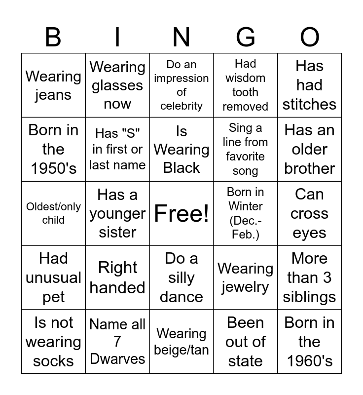This bingo card has a free space and 24 words: Right handed, Name all 7 Dwarves, Is Wearing Black, Is not wearing socks, Has had stitches, Wearing jeans, Born in the 1950's, Wearing glasses now, Born in Winter (Dec.-Feb.), Do a silly dance, Sing a line from favorite song, Oldest/only child, Wearing jewelry, More than 3 siblings, Has "S" in first or last name, Been out of state, Can cross eyes, Do an impression of celebrity, Has an older brother, Has a younger sister, Born in the 1960's, Had unusual pet, Had wisdom tooth removed and Wearing beige/tan.