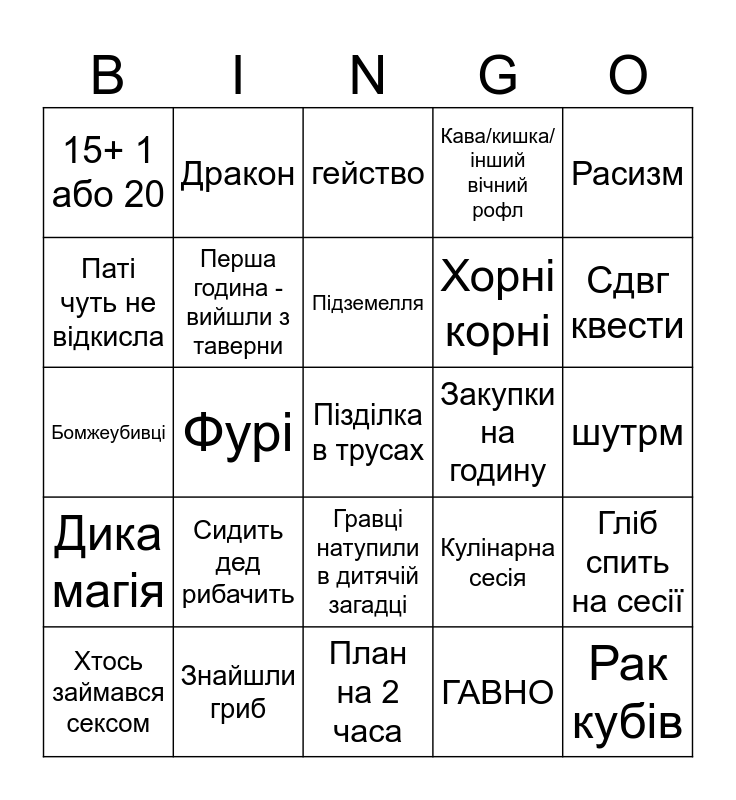 This bingo card has 30 words: Знайшли гриб, Газлайтнинг, Фурі, Згадка про можливість з'їбаться, 15+ 1 або 20, гейство, Перша година - вийшли з таверни, Гравці натупили в дитячій загадці, Закупки на годину, План на 2 часа, шутрм, Пізділка в трусах, ГАВНО, Рак кубів, Сдвг квести, Анекдот, Кулінарна сесія, Дика магія, Сидить дед рибачить, Расизм, Бомжеубивці, Стелс місія, Дракон, Хорні корні, Паті чуть не відкисла, Кава/кишка/ інший вічний рофл, Гліб спить на сесії, Хтось займався сексом, Підземелля and Хтось ударився головою об лампу.