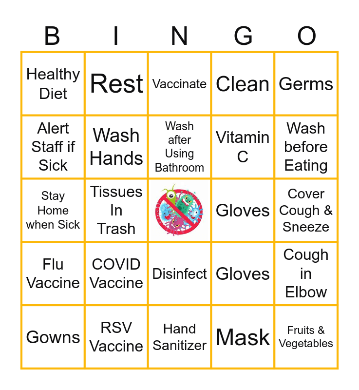 This bingo card has a free space and 24 words: COVID Vaccine, RSV Vaccine, Wash after Using Bathroom, Gowns, Germs, Healthy Diet, Alert Staff if Sick, Rest, Gloves, Disinfect, Vitamin C, Stay Home when Sick, Gloves, Cough in Elbow, Wash Hands, Mask, Cover Cough & Sneeze, Vaccinate, Wash before Eating, Tissues In Trash, Fruits & Vegetables, Flu Vaccine, Clean and Hand Sanitizer.