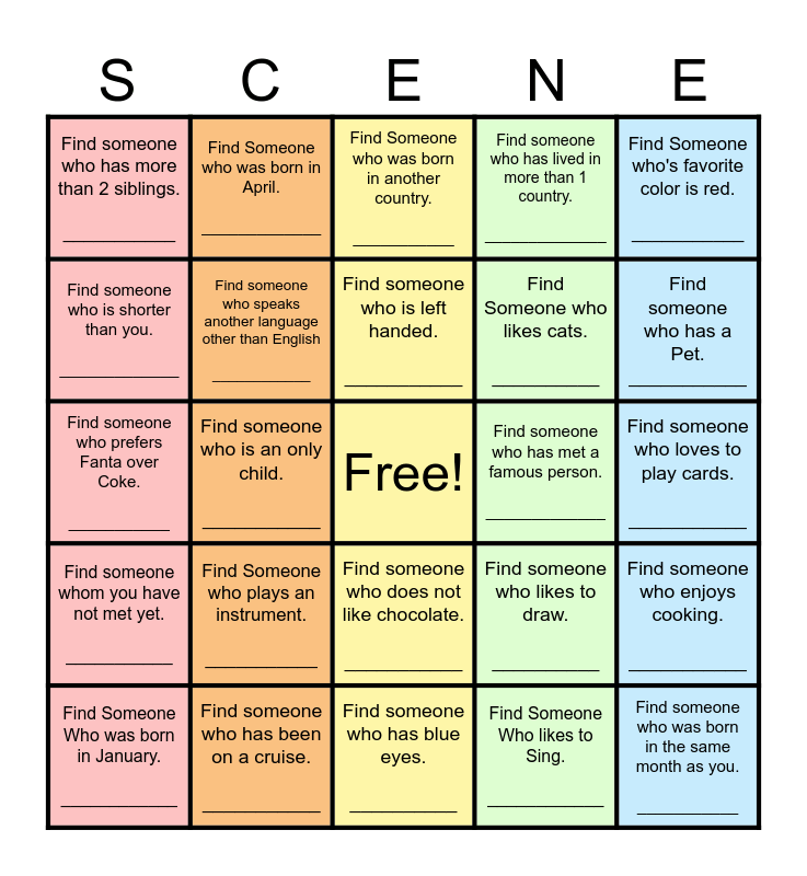 This bingo card has a free space and 25 words: Find Someone Who was born in January. ____________, Find Someone who plays an instrument. ___________, Find someone who is left handed. ___________, Find Someone Who likes to Sing. ____________, Find someone who has a Pet. ___________, Find someone who has more than 2 siblings. ___________, Find Someone who was born in April. _____________, Find Someone who was born in another country. ___________, Find Someone who likes cats. __________, Find someone who enjoys cooking. ___________, Find someone who prefers Fanta over Coke. ___________, Find someone who speaks another language other than English ____________, Find someone who likes to draw. __________, Find someone who was born in the same month as you. ___________, Find someone who is shorter than you. _____________, Find someone who has been on a cruise. ___________, Find someone who has blue eyes. __________, Find someone who has lived in more than 1 country. ______________, Find someone who loves to play cards. ___________, Find someone whom you have not met yet. ___________, Find someone who is an only child. ___________, Find someone who does not like chocolate. ___________, Find someone who has met a famous person. _____________, Find Someone who's favorite color is red. ___________ and Find someone who is wearing a blue shirt. ____________.