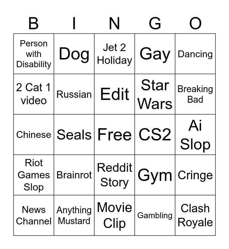 This bingo card has a free space and 24 words: Brainrot, Anything Mustard, Edit, News Channel, Dancing, Person with Disability, 2 Cat 1 video, Dog, CS2, Reddit Story, Star Wars, Chinese, Gym, Cringe, Russian, Gambling, Ai Slop, Jet 2 Holiday, Breaking Bad, Seals, Clash Royale, Riot Games Slop, Gay and Movie Clip.