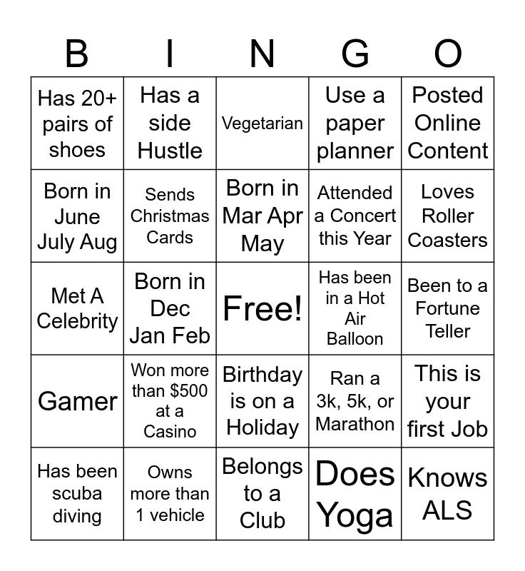 This bingo card has a free space and 77 words: Is Under 5' tall, Has Taken Martial Arts Class, Vegetarian, Knows how to Surf, Has Never Flown in an Airplane, Can do a Cart Wheel, Has dog(s), Gardens, True Crime Fan, Has Never Changed a Diaper, Like Pineapple on Pizza, Only Child, Born in Mar Apr May, Born in June July Aug, Born in Sept Oct Nov, Born in Dec Jan Feb, Good Cook, Knows ALS, Sings in the Shower, Posted Online Content, Twin or Triplet, Met A Celebrity, Sends Christmas Cards, Has a side Hustle, Use a paper planner, Has 20+ t-shirts, Moved this past year, Has Been to more than 10 states, Is left handed, Has 4+ pairs of glasses, Has been on a road trip, Won an eating competition, Been to Disney, Ran a 3k, 5k, or Marathon, Loves Roller Coasters, Attended a Concert this Year, Bought a car this year, Loves Karaoke, Been to a Fortune Teller, Does Yoga, Has a Bucket List, Can Hula Hoop, Loves Naps, Podcast Fan, Own Stock, Has a tatoo, Has been scuba diving, Has 20+ pairs of shoes, Named After a Relative, Has a favorite Pen, Wears Contacts, Birthday is on a Holiday, Professional Sports Fan, Can Drive a Stick, Travled this past year, Grandparent, Plays an instrument, Can Ride a Motorcycle, Has a pair of Crocs, Has cat(s), Won more than $500 at a Casino, Hates Sour Cream, Rides Horses, Horro Fan, Has a phobia, Coffee Lover, Decorates for Holidays, Has been in a Hot Air Balloon, Artist / Crafts, Never learned to ride a bike, Mixologist, This is your first Job, Gamer, Owns more than 1 vehicle, Has a food allergy, Belongs to a Club and Has a snack stach.