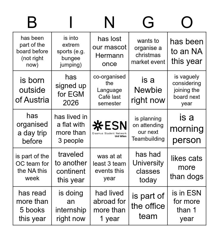 This bingo card has a free space and 24 words: traveled to another continent this year, is doing an internship right now, co-organised the Language Café last semester, has read more than 5 books this year, has been to an NA this year, has been part of the board before (not right now), is born outside of Austria, is into extrem sports (e.g. bungee jumping), is planning on attending our next Teambuilding, was at at least 3 team events this year, is a Newbie right now, has organised a day trip before, has had University classes today, likes cats more than dogs, has signed up for EGM 2026, is part of the office team, is a morning person, has lost our mascot Hermann once, is vaguely considering joining the board next year, has lived in a flat with more than 3 people, is in ESN for more than 1 year, is part of the OC team for the NA this week, wants to organise a christmas market event and had lived abroad for more than 1 year.