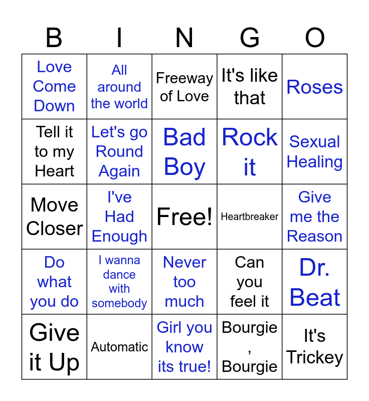 This bingo card has a free space and 24 words: I wanna dance with somebody, Automatic, Bad Boy, Give it Up, Roses, Love Come Down, Tell it to my Heart, All around the world, Heartbreaker, Never too much, Rock it, Move Closer, Can you feel it, Dr. Beat, Let's go Round Again, Bourgie , Bourgie, Give me the Reason, Freeway of Love, Sexual Healing, I've Had Enough, It's Trickey, Do what you do, It's like that and Girl you know its true!.