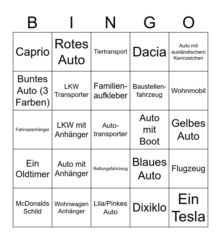 This bingo card has 42 words: Polnisches Auto, Rotes Auto, Grünes Auto, Blaues Auto, Gelbes Auto, McDonalds Schild, Auto mit Anhänger, Reisebus, Baustellen-fahrzeug, Wohnmobil, Fahrradanhänger, LKW mit Anhänger, Auto-transporter, Auto mit Boot, Ein Tesla, Ein Oldtimer, Ein Motorrad, Familien-aufkleber, Mensch auf Brücke, Auto mit ausländischem Kennzeichen, Buntes Auto (3 Farben), Ein Porsche, Lila/Pinkes Auto, Dacia, Amazon Transporter, ADAC Auto, LKW Transporter, Holztransporter, Dachgepäck, Flugzeug, Gelbes Kennzeichen, Wohnwagen Anhänger, Tiertransport, Dixiklo, Baucontainer, Auto am Standstreifen, Stau, Rettungsfahrzeug, Polizeiwagen, Kleinbus, Caprio and Kuh.