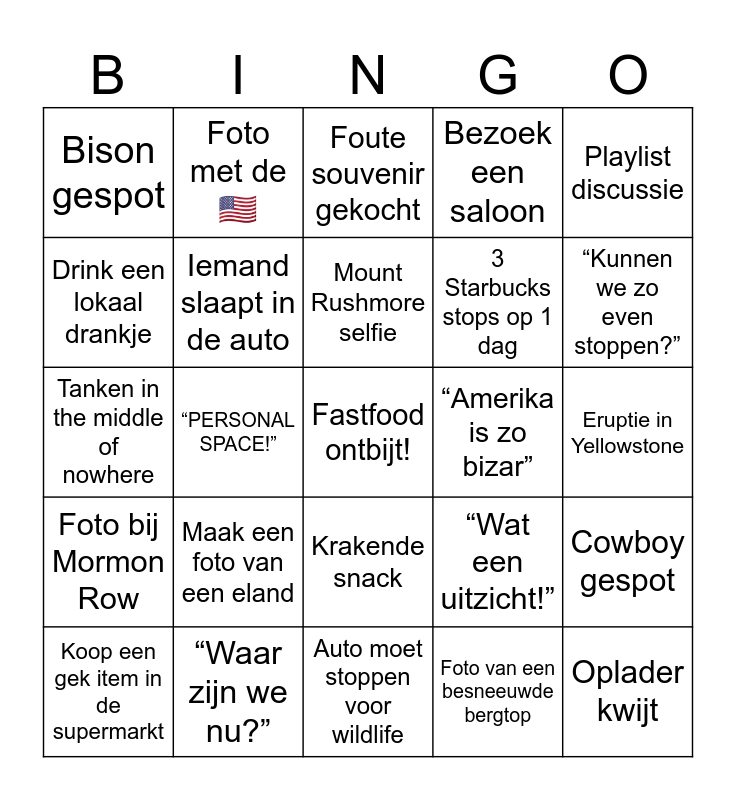 This bingo card has a free space and 24 words: Maak een foto van een eland, “Waar zijn we nu?”, Mount Rushmore selfie, Koop een gek item in de supermarkt, Playlist discussie, Bison gespot, Drink een lokaal drankje, Foto met de 🇺🇸, “Amerika is zo bizar”, Krakende snack, 3 Starbucks stops op 1 dag, Tanken in the middle of nowhere, “Wat een uitzicht!”, Cowboy gespot, Iemand slaapt in de auto, Foto van een besneeuwde bergtop, Eruptie in Yellowstone, Foute souvenir gekocht, “Kunnen we zo even stoppen?”, “PERSONAL SPACE!”, Oplader kwijt, Foto bij Mormon Row, Bezoek een saloon and Auto moet stoppen voor wildlife.