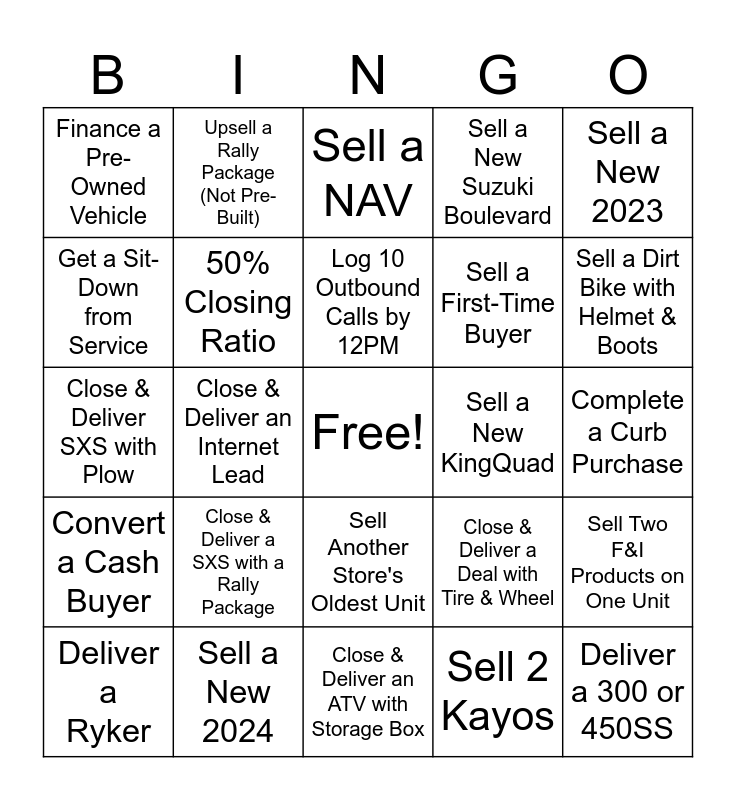 This bingo card has a free space and 44 words: Deliver a Defender, Deliver a 300 or 450SS, Deliver a Yamaha, Deliver a Ryker, Deliver a Suzuki, Sell 2 Kayos, Sell a NAV, Sell Your Store's Oldest Unit, Sell a New 2023, Sell a New 2024, Sell a New Suzuki Boulevard, Sell a New KingQuad, Sell Another Store's Oldest Unit, Close & Deliver a SXS with a Rally Package, Close & Deliver an ATV with Snow Plow, Close & Deliver an ATV with Storage Box, Close & Deliver SXS with Cold Front Package, Close & Deliver SXS with Plow, Close & Deliver Street Motorcycle with Helmet & Jacket, Sell a Dirt Bike with Helmet & Boots, Upsell a Rally Package (Not Pre-Built), Sell Oil Change Kit with a Unit, Sell Two Pre-Owned in One Day, Finance a Pre-Owned Vehicle, Bring in a Repeat Buyer with a Trade, Complete a Curb Purchase, Sell a Pre-Owned at Original Asking Price, Close a Deal with Pre-Paid Maintenance, Close & Deliver a Deal with Tire & Wheel, Convert a Cash Buyer, Sell GAP, Sell Two F&I Products on One Unit, Get a 5-Star Google Review, Close & Deliver a Walk-In, Close & Deliver an Internet Lead, Follow-Up with 10 Unsold Leads, Close & Deliver Somone Else's Cold Lead, Film a Walk-Around Video for Social, Log 10 Outbound Calls by 12PM, Get a Sit-Down from Service, Sell a First-Time Buyer, Take Over and Deliver a BDC Lead, 50% Closing Ratio and Sell a Kawasaki-provided Lead.