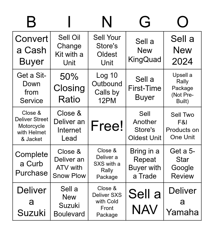 This bingo card has a free space and 43 words: Deliver a 300 or 450SS, Deliver a Yamaha, Deliver a Ryker, Deliver a Suzuki, Sell 2 Kayos, Sell a NAV, Sell Your Store's Oldest Unit, Sell a New 2023, Sell a New 2024, Sell a New Suzuki Boulevard, Sell a New KingQuad, Sell Another Store's Oldest Unit, Close & Deliver a SXS with a Rally Package, Close & Deliver an ATV with Snow Plow, Close & Deliver an ATV with Storage Box, Close & Deliver SXS with Cold Front Package, Close & Deliver SXS with Plow, Close & Deliver Street Motorcycle with Helmet & Jacket, Sell a Dirt Bike with Helmet & Boots, Upsell a Rally Package (Not Pre-Built), Sell Oil Change Kit with a Unit, Close a Deal with Pre-Paid Maintenance, Close & Deliver a Deal with Tire & Wheel, Convert a Cash Buyer, Sell GAP, Sell Two F&I Products on One Unit, Sell Two Pre-Owned in One Day, Finance a Pre-Owned Vehicle, Bring in a Repeat Buyer with a Trade, Complete a Curb Purchase, Sell a Pre-Owned at Original Asking Price, Get a 5-Star Google Review, Close & Deliver a Walk-In, Close & Deliver an Internet Lead, Follow-Up with 10 Unsold Leads, Close & Deliver Somone Else's Cold Lead, Film a Walk-Around Video for Social, Log 10 Outbound Calls by 12PM, Get a Sit-Down from Service, Sell a First-Time Buyer, Take Over and Deliver a BDC Lead, 50% Closing Ratio and Sell a Kawasaki-provided Lead.