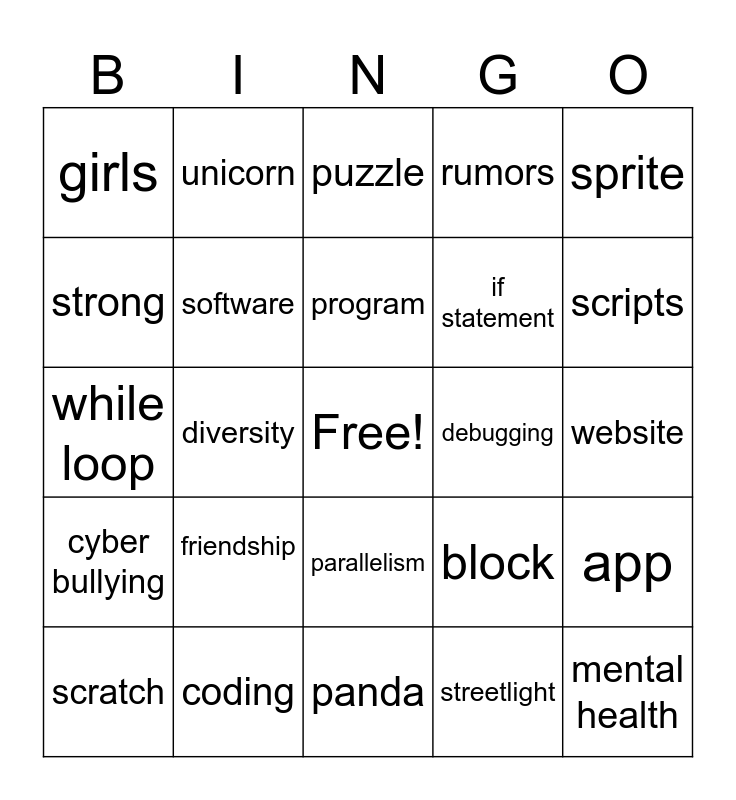 This bingo card has a free space and 24 words: friendship, coding, program, scratch, sprite, girls, strong, unicorn, debugging, parallelism, if statement, while loop, block, app, software, streetlight, website, puzzle, scripts, diversity, mental health, cyber bullying, rumors and panda.