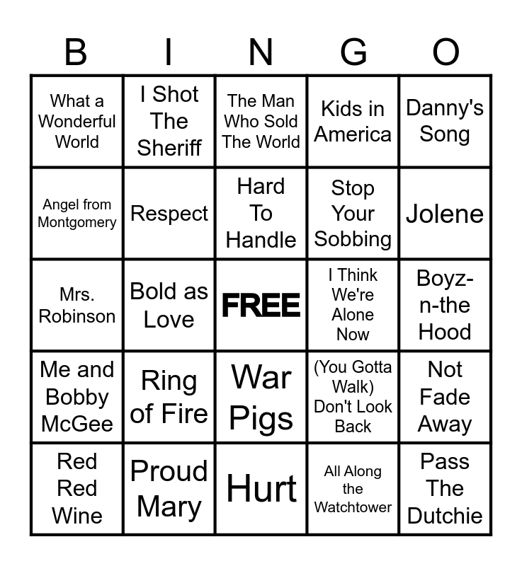 This bingo card has a free space and 44 words: Africa, Pass The Dutchie, Tainted Love, Red Red Wine, Smooth Criminal, All Along the Watchtower, The Man Who Sold The World, Scarlet Begonias, Danny's Song, Proud Mary, Kids in America, I Think We're Alone Now, War Pigs, Ring of Fire, You Really Got Me, Hurt, In Bloom, Mrs. Robinson, Crimson and Clover, Jolene, I Shot The Sheriff, The Boys of Summer, Pictures Of Matchstick Men, What a Wonderful World, Breathless, Boyz-n-the Hood, Don't Think Twice, Go Your Own Way, (You Gotta Walk) Don't Look Back, Me and Bobby McGee, Touch of Grey, Not Fade Away, Heartbeat, Hash Pipe, Bold as Love, Stand By Your Man, Let's Spend The Night Together, Our Lips Are Sealed, Hard To Handle, Angel from Montgomery, Stop Your Sobbing, It's My Life, Respect and I Will Always Love You.