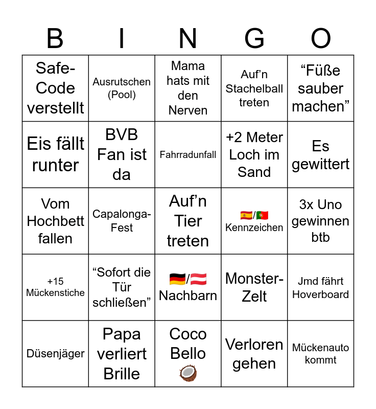 This bingo card has a free space and 24 words: Düsenjäger, “Sofort die Tür schließen”, Fahrradunfall, Verloren gehen, “Füße sauber machen”, Safe-Code verstellt, Ausrutschen (Pool), Mama hats mit den Nerven, 🇪🇸/🇵🇹 Kennzeichen, 3x Uno gewinnen btb, Vom Hochbett fallen, BVB Fan ist da, Monster-Zelt, Jmd fährt Hoverboard, Eis fällt runter, Papa verliert Brille, Coco Bello 🥥, Auf’n Stachelball treten, Es gewittert, +15 Mückenstiche, Capalonga-Fest, 🇩🇪/🇦🇹 Nachbarn, +2 Meter Loch im Sand and Mückenauto kommt.