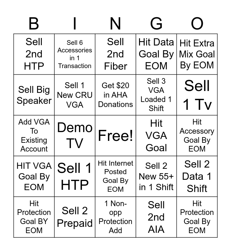 This bingo card has a free space and 24 words: Sell 1 HTP, Sell 2 Prepaid, Get $20 in AHA Donations, Hit Protection Goal BY EOM, Hit Extra Mix Goal By EOM, Sell 2nd HTP, Sell Big Speaker, Sell 6 Accessories in 1 Transaction, Hit VGA Goal, Hit Internet Posted Goal By EOM, Sell 3 VGA Loaded 1 Shift, Add VGA To Existing Account, Sell 2 New 55+ in 1 Shift, Sell 2 Data 1 Shift, Sell 1 New CRU VGA, Sell 2nd AIA, Hit Accessory Goal By EOM, Sell 2nd Fiber, Sell 1 Tv, Demo TV, Hit Protection Goal By EOM, HIT VGA Goal By EOM, Hit Data Goal By EOM and 1 Non-opp Protection Add.