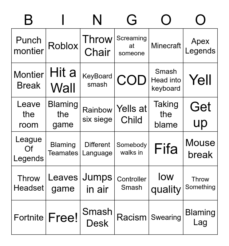 This bingo card has 36 words: Controller Smash, Jumps in air, Racism, Montier Break, League Of Legends, Yells at Child, Hit a Wall, Smash Desk, Minecraft, low quality, Yell, Screaming at someone, Throw Something, Blaming the game, COD, Punch montier, Throw Headset, Taking the blame, Leave the room, Throw Chair, Rainbow six siege, Blaming Teamates, Somebody walks in, Different Language, Fifa, Roblox, Smash Head into keyboard, Free!, KeyBoard smash, Apex Legends, Blaming Lag, Fortnite, Mouse break, Get up, Leaves game and Swearing.