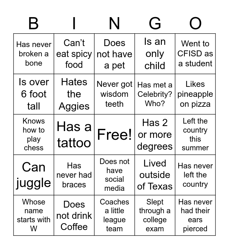 This bingo card has a free space and 70 words: Does yoga, Left the country this summer, Has a blue car, Is left handed, Does not drink Coffee, Has been in Education 10 Years or more, Is an only child, Speaks 2 languages, Went to CFISD as a student, Move a kid into college, Has never left the country, Has a birthday in August, Has never broken a bone, Does not have a pet, Has never been on a boat, Has a tattoo, Does not have social media, Has met a Celebrity? Who?, Has run a marathon, Can juggle, Has 2 or more degrees, Lived outside of Texas, Likes pineapple on pizza, Has a side hustle, Read more than 5 books this summer, Can do a cartwheel, Has to drive more than 30 minutes to work, Favorite color is yellow, Slept through a college exam, Has a pet lizard, Can’t eat spicy food, Never seen a Star Wars movie before, Flosses teeth everyday, Grows their own vegetables, Certified in Scuba, Has never been on a plane before, Owns a motorcycle, Is vegan/ vegetarian, Is a natural red head, Is over 6 foot tall, Who has never worn glasses, Has never had braces, Has never had their ears pierced, Does not like pizza, Went to a concert this summer, Hates the Aggies, Whose name starts with W, Eats the cafeteria food at least 3 days a week, Has 4 or more children, Has studied abroad, Still roller skates, Ridden on a train, Has hitch hiked, Plays on a team sport, Coaches a little league team, Still has a stuffed animal as an adult, Never got wisdom teeth, Is wearing neon, Has never eaten sushi, Exercises before work, Knows how to play chess, Does not like chocolate, Has changed careers, Takes naps every weekend, Can name all zodiac signs, Is 24 or younger, Owns chickens, Has taken dance lessons as an adult, Has only brothers and Can solve a Rubik’s cube.