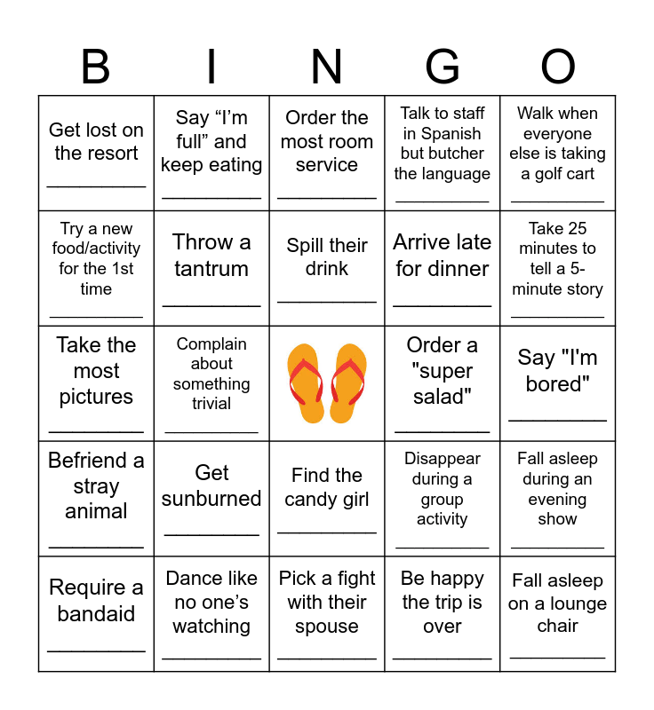 This bingo card has a free space and 24 words: Get sunburned ________, Dance like no one’s watching _________, Spill their drink _________, Require a bandaid ________, Walk when everyone else is taking a golf cart __________, Get lost on the resort _________, Try a new food/activity for the 1st time __________, Say “I’m full” and keep eating _________, Order a "super salad" ________, Find the candy girl _________, Arrive late for dinner ________, Take the most pictures ________, Disappear during a group activity __________, Fall asleep during an evening show __________, Throw a tantrum ________, Be happy the trip is over _________, Say "I'm bored" ________, Order the most room service _________, Take 25 minutes to tell a 5-minute story __________, Complain about something trivial __________, Fall asleep on a lounge chair _________, Befriend a stray animal ________, Talk to staff in Spanish but butcher the language __________ and Pick a fight with their spouse _________.