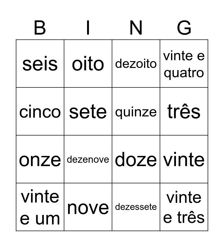 This bingo card has 25 words: um, dois, três, quatro, cinco, seis, sete, oito, nove, dez, onze, doze, treze, quatorze, quinze, dezesseis, dezessete, dezoito, dezenove, vinte, vinte e um, vinte e dois, vinte e três, vinte e quatro and vinte e cinco.
