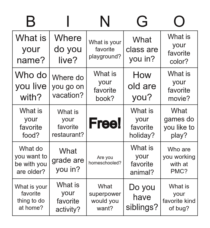This bingo card has a free space and 24 words: What grade are you in?, What is your favorite activity?, What is your favorite book?, What is your favorite thing to do at home?, What is your favorite color?, What is your name?, Who do you live with?, Where do you live?, What is your favorite holiday?, Are you homeschooled?, How old are you?, What is your favorite food?, What is your favorite animal?, Who are you working with at PMC?, Where do you go on vacation?, Do you have siblings?, What games do you like to play?, What is your favorite playground?, What is your favorite movie?, What is your favorite restaurant?, What is your favorite kind of bug?, What do you want to be with you are older?, What class are you in? and What superpower would you want?.
