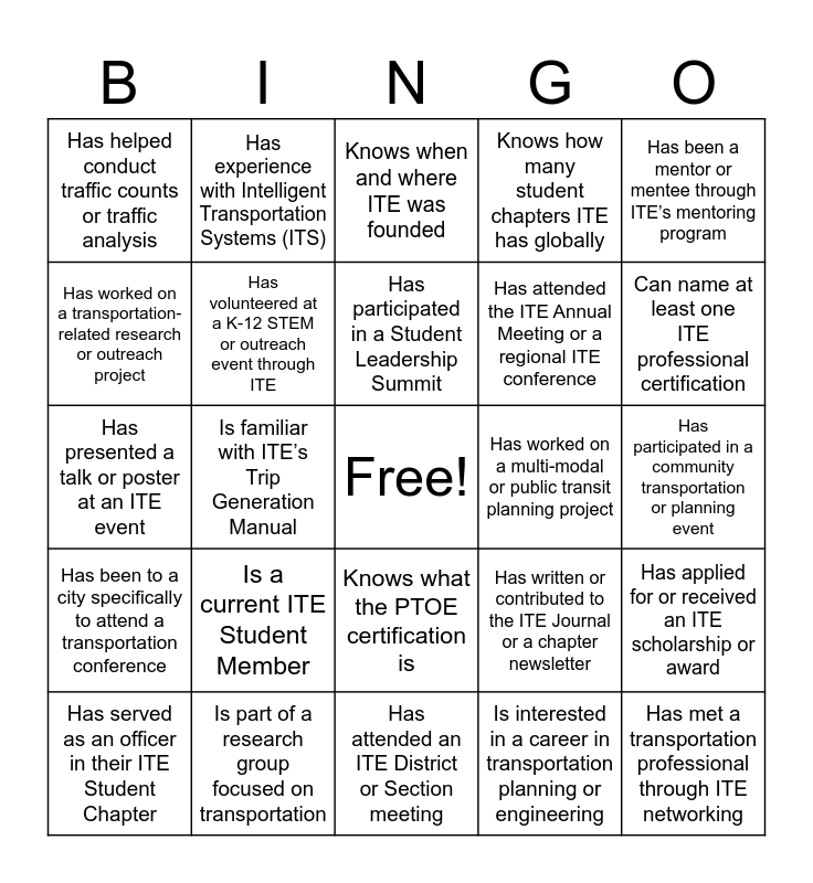 This bingo card has a free space and 25 words: Is a current ITE Student Member, Has attended an ITE District or Section meeting, Has participated in a Student Leadership Summit, Has served as an officer in their ITE Student Chapter, Has been a mentor or mentee through ITE’s mentoring program, Has helped conduct traffic counts or traffic analysis, Has worked on a transportation-related research or outreach project, Has experience with Intelligent Transportation Systems (ITS), Has worked on a multi-modal or public transit planning project, Knows what the PTOE certification is, Has attended the ITE Annual Meeting or a regional ITE conference, Has presented a talk or poster at an ITE event, Has written or contributed to the ITE Journal or a chapter newsletter, Has applied for or received an ITE scholarship or award, Has volunteered at a K-12 STEM or outreach event through ITE, Has organized or attended an ITE social event (e.g., trivia, BBQ), Has participated in a community transportation or planning event, Knows when and where ITE was founded, Can name at least one ITE professional certification, Is familiar with ITE’s Trip Generation Manual, Has met a transportation professional through ITE networking, Is part of a research group focused on transportation, Has been to a city specifically to attend a transportation conference, Knows how many student chapters ITE has globally and Is interested in a career in transportation planning or engineering.
