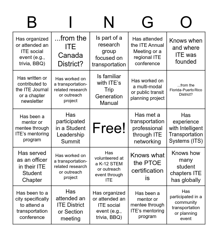This bingo card has a free space and 60 words: Is a current ITE Student Member, Has attended an ITE District or Section meeting, Has participated in a Student Leadership Summit, Has served as an officer in their ITE Student Chapter, Has been a mentor or mentee through ITE’s mentoring program, Has helped conduct traffic counts or traffic analysis, Has worked on a transportation-related research or outreach project, Has experience with Intelligent Transportation Systems (ITS), Has worked on a multi-modal or public transit planning project, Knows what the PTOE certification is, Has attended the ITE Annual Meeting or a regional ITE conference, Has presented a talk or poster at an ITE event, Has written or contributed to the ITE Journal or a chapter newsletter, Has applied for or received an ITE scholarship or award, Has volunteered at a K-12 STEM or outreach event through ITE, Has organized or attended an ITE social event (e.g., trivia, BBQ), Has participated in a community transportation or planning event, Knows when and where ITE was founded, Can name at least one ITE professional certification, Is familiar with ITE’s Trip Generation Manual, Has met a transportation professional through ITE networking, Is part of a research group focused on transportation, Has been to a city specifically to attend a transportation conference, Knows how many student chapters ITE has globally, Is interested in a career in transportation planning or engineering, ...from the Northeastern District?, ...from the Mid‑Colonial District?, ...from the Southern District?, ...from the Florida‑Puerto Rico District?, ...from the Texas District?, ...from the Missouri Valley District?, ...from the Great Lakes District?, ...from the Mountain District?, ...from the Western District?, ...from the ITE Canada District?, Is a current ITE Student Member, Has attended an ITE District or Section meeting, Has participated in a Student Leadership Summit, Has served as an officer in their ITE Student Chapter, Has been a mentor or mentee through ITE’s mentoring program, Has helped conduct traffic counts or traffic analysis, Has worked on a transportation-related research or outreach project, Has experience with Intelligent Transportation Systems (ITS), Has worked on a multi-modal or public transit planning project, Knows what the PTOE certification is, Has attended the ITE Annual Meeting or a regional ITE conference, Has presented a talk or poster at an ITE event, Has written or contributed to the ITE Journal or a chapter newsletter, Has applied for or received an ITE scholarship or award, Has volunteered at a K-12 STEM or outreach event through ITE, Has organized or attended an ITE social event (e.g., trivia, BBQ), Has participated in a community transportation or planning event, Knows when and where ITE was founded, Can name at least one ITE professional certification, Is familiar with ITE’s Trip Generation Manual, Has met a transportation professional through ITE networking, Is part of a research group focused on transportation, Has been to a city specifically to attend a transportation conference, Knows how many student chapters ITE has globally and Is interested in a career in transportation planning or engineering.