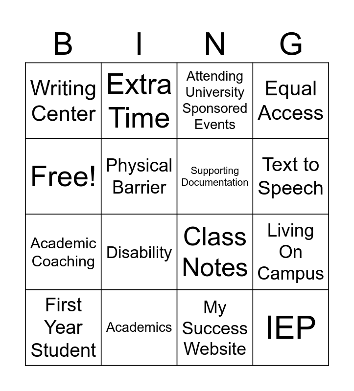 This bingo card has 16 words: Academics, Living On Campus, Attending University Sponsored Events, Writing Center, Academic Coaching, Extra Time, Class Notes, My Success Website, Free!, Physical Barrier, First Year Student, Equal Access, Disability, Text to Speech, Supporting Documentation and IEP.