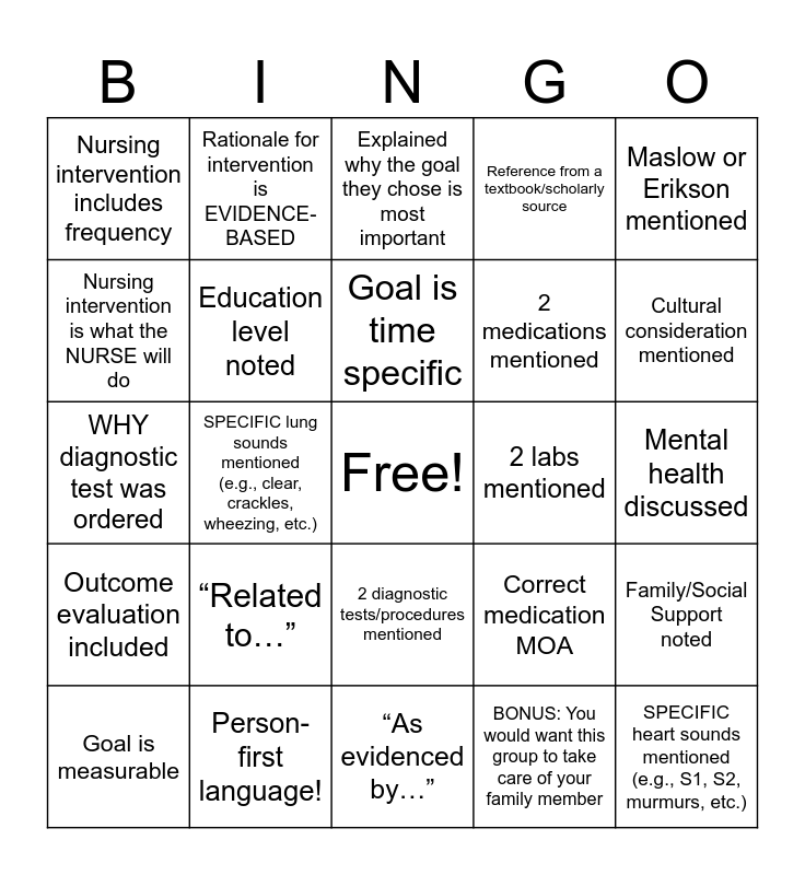 This bingo card has a free space and 25 words: “Related to…”, “As evidenced by…”, Goal is time specific, Goal is measurable, Maslow or Erikson mentioned, Nursing intervention includes frequency, Nursing intervention is what the NURSE will do, Rationale for intervention is EVIDENCE-BASED, 2 labs mentioned, 2 diagnostic tests/procedures mentioned, 2 medications mentioned, WHY diagnostic test was ordered, Correct medication MOA, Family/Social Support noted, Education level noted, Access to utilities mentioned (e.g., water, electricity, etc.), Mental health discussed, Explained why the goal they chose is most important, Cultural consideration mentioned, SPECIFIC lung sounds mentioned (e.g., clear, crackles, wheezing, etc.), SPECIFIC heart sounds mentioned (e.g., S1, S2, murmurs, etc.), Person-first language!, Outcome evaluation included, Reference from a textbook/scholarly source and BONUS: You would want this group to take care of your family member.