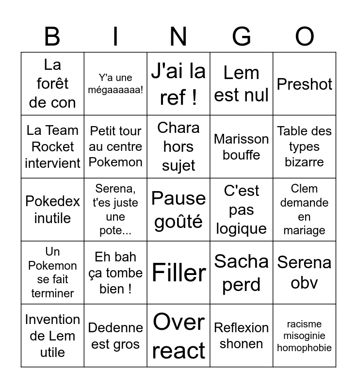 This bingo card has a free space and 24 words: Eh bah ça tombe bien !, Dedenne est gros, Chara hors sujet, Invention de Lem utile, Preshot, La forêt de con, La Team Rocket intervient, Y'a une mégaaaaaa!, C'est pas logique, Filler, Marisson bouffe, Pokedex inutile, Sacha perd, Serena obv, Petit tour au centre Pokemon, Reflexion shonen, Clem demande en mariage, J'ai la ref !, Table des types bizarre, Serena, t'es juste une pote..., racisme misoginie homophobie, Un Pokemon se fait terminer, Lem est nul and Over react.