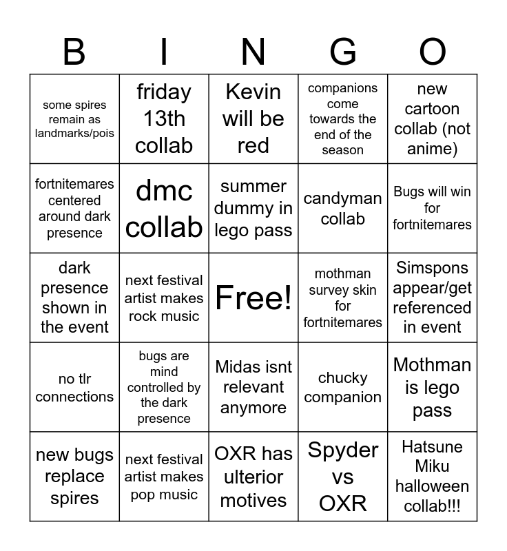 This bingo card has a free space and 24 words: new bugs replace spires, bugs are mind controlled by the dark presence, summer dummy in lego pass, Spyder vs OXR, new cartoon collab (not anime), some spires remain as landmarks/pois, friday 13th collab, Kevin will be red, mothman survey skin for fortnitemares, Simspons appear/get referenced in event, dark presence shown in the event, dmc collab, chucky companion, Mothman is lego pass, fortnitemares centered around dark presence, next festival artist makes pop music, OXR has ulterior motives, companions come towards the end of the season, Bugs will win for fortnitemares, no tlr connections, next festival artist makes rock music, Midas isnt relevant anymore, candyman collab and Hatsune Miku halloween collab!!!.