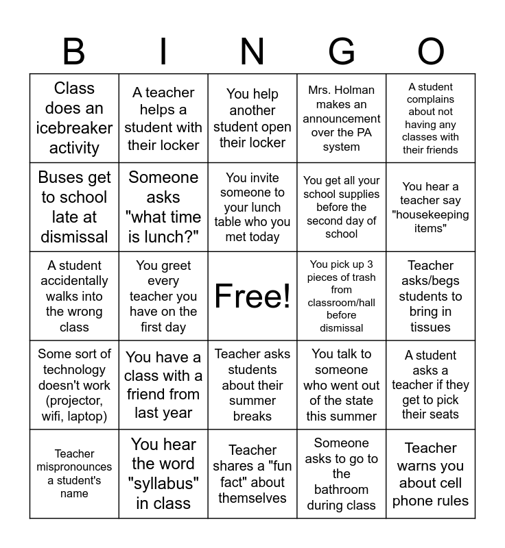 This bingo card has a free space and 29 words: Teacher mispronounces a student's name, You talk to a student you've never met before, You greet every teacher you have on the first day, Fire drill instructions are given, Class does an icebreaker activity, You help another student open their locker, Someone asks "what time is lunch?", You have a class with a friend from last year, You pick up 3 pieces of trash from classroom/hall before dismissal, You hear the word "syllabus" in class, Teacher asks/begs students to bring in tissues, Teacher warns you about cell phone rules, Teacher shares a "fun fact" about themselves, Someone asks to go to the bathroom during class, You hear a teacher say "housekeeping items", You meet someone who didn't go to FC Schools last year, Teacher asks students about their summer breaks, Some sort of technology doesn't work (projector, wifi, laptop), A student complains about not having any classes with their friends, A student accidentally walks into the wrong class, You talk to someone who went out of the state this summer, You volunteer to do something for a teacher, You get all your school supplies before the second day of school, Buses get to school late at dismissal, Mrs. Holman makes an announcement over the PA system, A teacher helps a student with their locker, A student asks a teacher if they get to pick their seats, You invite someone to your lunch table who you met today and Teacher goes over tardy policy.