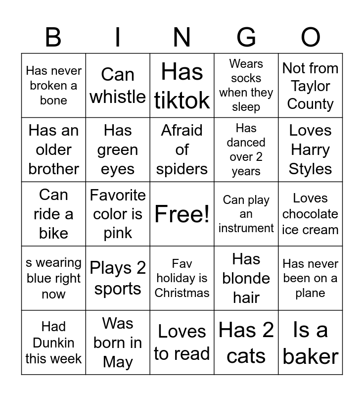 This bingo card has a free space and 24 words: Plays 2 sports, Was born in May, Afraid of spiders, Had Dunkin this week, Not from Taylor County, Has never broken a bone, Has an older brother, Can whistle, Can play an instrument, Fav holiday is Christmas, Has danced over 2 years, Can ride a bike, Has blonde hair, Has never been on a plane, Has green eyes, Has 2 cats, Loves chocolate ice cream, Has tiktok, Loves Harry Styles, Favorite color is pink, Is a baker, s wearing blue right now, Wears socks when they sleep and Loves to read.
