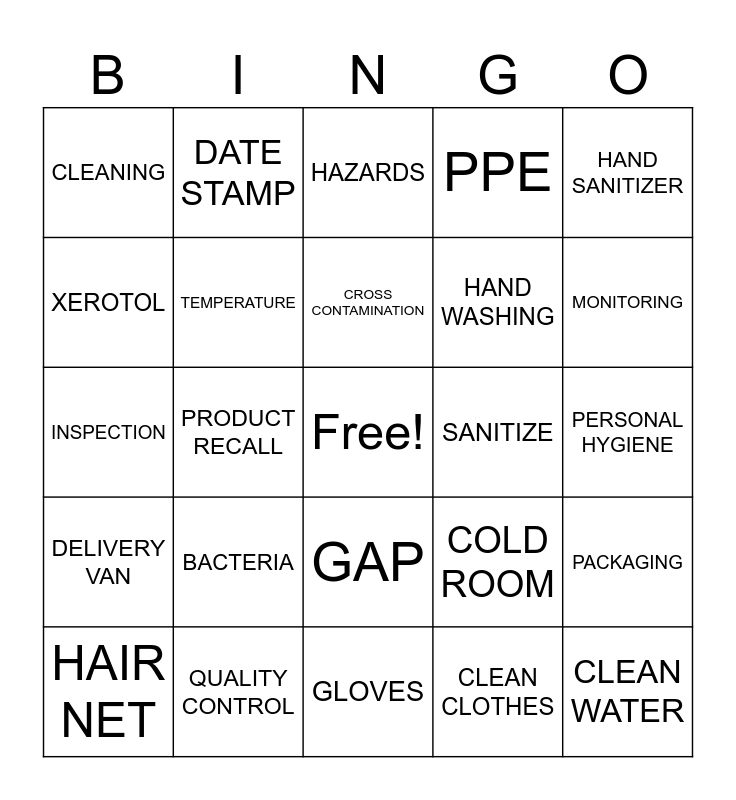 This bingo card has a free space and 25 words: BACTERIA, GLOVES, CROSS CONTAMINATION, HAIR NET, HAND SANITIZER, CLEANING, XEROTOL, DATE STAMP, SANITIZE, GAP, HAND WASHING, INSPECTION, COLD ROOM, PACKAGING, TEMPERATURE, SOP, PERSONAL HYGIENE, HAZARDS, MONITORING, PRODUCT RECALL, CLEAN WATER, QUALITY CONTROL, DELIVERY VAN, PPE and CLEAN CLOTHES.