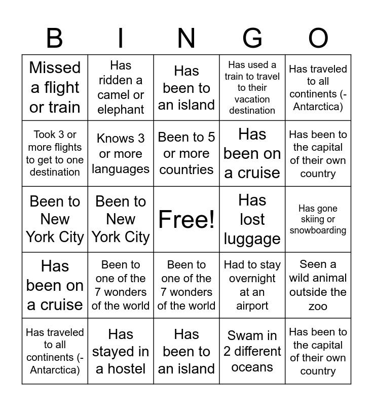 ⚠ This card has duplicate items: Has been to the capital of their own country (2), Has been surfing or snorkeling (2), Has been to an island (2), Been to one of the 7 wonders of the world (2), Been to the west coast (2), Has ridden a camel or elephant (2), Had travel places canceled b/c of Covid (2), Took 3 or more flights to get to one destination (2), Has stayed in a hostel (2), Knows 3 or more languages (2), Has used a train to travel to their vacation destination (2), Seen a wild animal outside the zoo (2), Had to stay overnight at an airport (2), Has gone skiing or snowboarding (2), Tried a new food while traveling (2), Been to 5 or more countries (2), Has lost luggage (2), Has been on a boat (2), Has traveled to all continents (- Antarctica) (2), Been to New York City (2), Swam in 2 different oceans (2), Missed a flight or train (2), Has been on a cruise (2), Gotten lost in a foreign city (2)