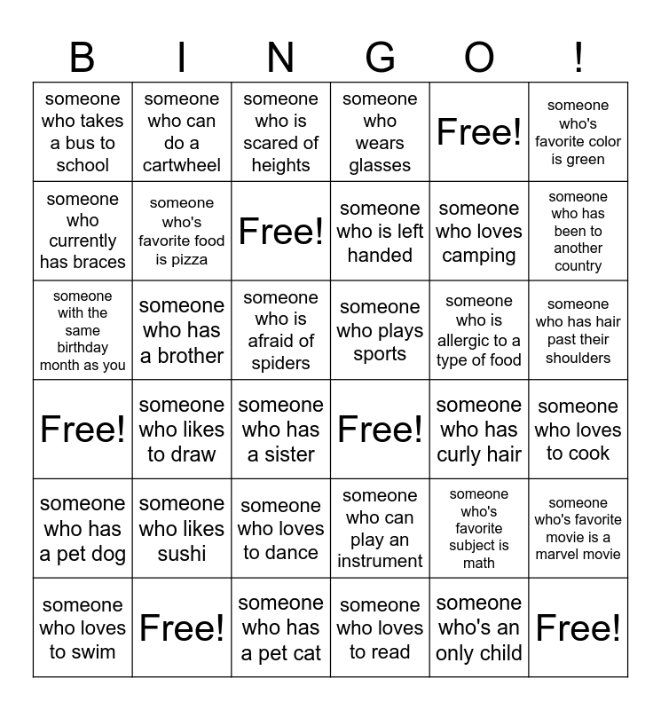 This bingo card has 36 words: Free!, someone who likes to draw, someone who has a pet cat, someone who is left handed, someone who is allergic to a type of food, someone who has hair past their shoulders, someone who takes a bus to school, Free!, someone who is scared of heights, someone who can play an instrument, someone who loves camping, someone who's favorite color is green, someone who has a pet dog, someone who has a brother, Free!, someone who wears glasses, someone who's favorite subject is math, someone who loves to cook, someone who currently has braces, someone who's favorite food is pizza, someone who has a sister, Free!, someone who has curly hair, someone who's favorite movie is a marvel movie, someone with the same birthday month as you, someone who can do a cartwheel, someone who is afraid of spiders, someone who loves to read, Free!, someone who has been to another country, someone who loves to swim, someone who likes sushi, someone who loves to dance, someone who plays sports, someone who's an only child and Free!.