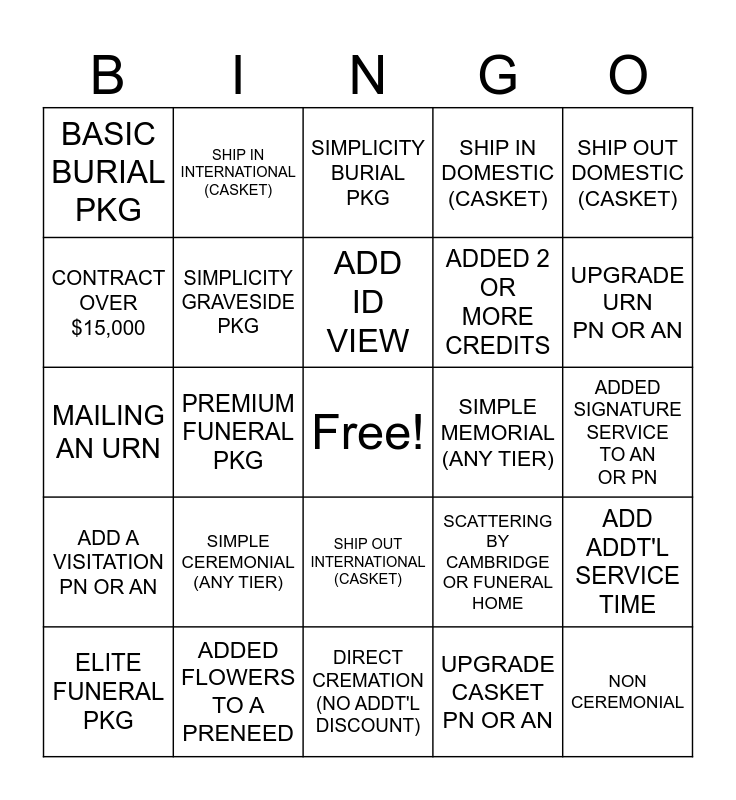 This bingo card has a free space and 29 words: ELITE FUNERAL PKG, CUSTOM FUNERAL PKG, PREMIUM FUNERAL PKG, STANDARD FUNERAL PKG, BASIC BURIAL PKG, SIMPLICITY BURIAL PKG, SIMPLICITY GRAVESIDE PKG, SIMPLE CEREMONIAL (ANY TIER), SIMPLE MEMORIAL (ANY TIER), ADDED FLOWERS TO A PRENEED, ADDED SIGNATURE SERVICE TO AN OR PN, NON CEREMONIAL, DIRECT CREMATION (NO ADDT'L DISCOUNT), UPGRADE CASKET PN OR AN, UPGRADE URN PN OR AN, ADD SATURDAY OR SUNDAY FEE, SHIP OUT INTERNATIONAL (CASKET), ADD A VISITATION PN OR AN, SHIP OUT DOMESTIC (CASKET), MAILING AN URN, SCATTERING BY CAMBRIDGE OR FUNERAL HOME, ADDED ADDT'L FLOWERS TO AN AN CONTRACT, ADDED 2 OR MORE CREDITS, CONTRACT OVER $15,000, SHIP IN DOMESTIC (CASKET), SHIP IN INTERNATIONAL (CASKET), ADD ADDT'L SERVICE TIME, ADD ID VIEW and ITEMIZED CONTRACT OVER $10,000.