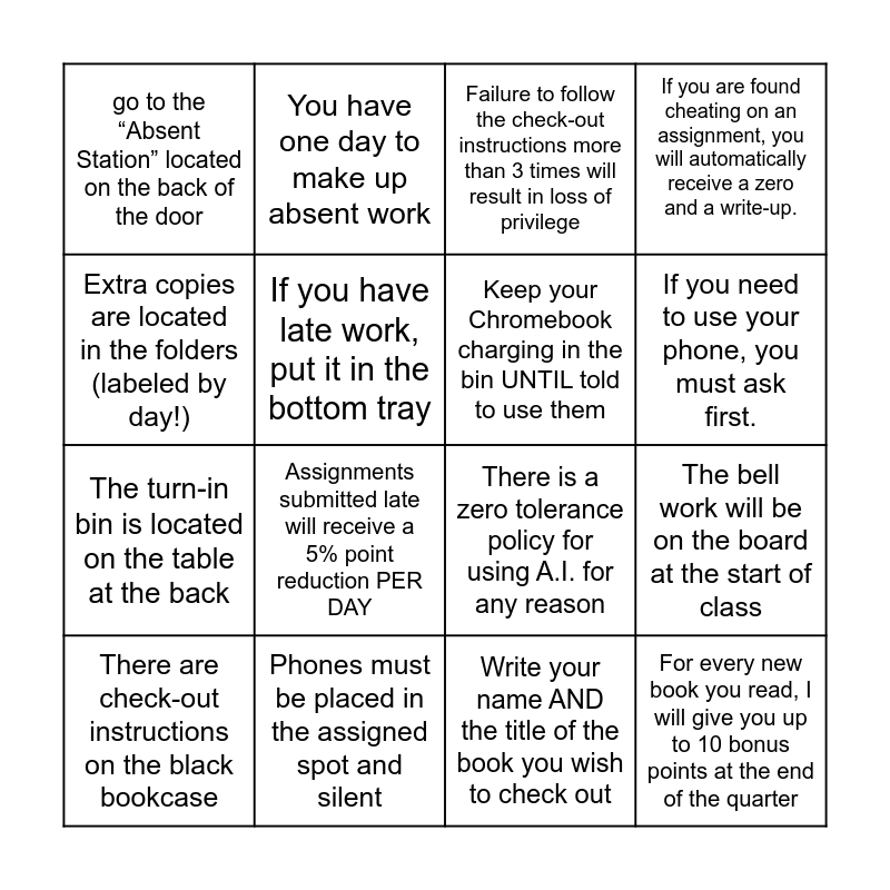 This bingo card has 20 words: The bell work will be on the board at the start of class, I will post the daily agenda on Google Classroom before the start of class, Failure to follow the check-out instructions more than 3 times will result in loss of privilege, FREE SPACE, There are check-out instructions on the black bookcase, Extra copies are located in the folders (labeled by day!), Phones must be placed in the assigned spot and silent, go to the “Absent Station” located on the back of the door, The turn-in bin is located on the table at the back, You have one day to make up absent work, Assignments submitted late will receive a 5% point reduction PER DAY, There is a zero tolerance policy for using A.I. for any reason, If you have late work, put it in the bottom tray, For every new book you read, I will give you up to 10 bonus points at the end of the quarter, Keep your Chromebook charging in the bin UNTIL told to use them, The short answer will always be... yes!, If you need to use your phone, you must ask first., If you are found cheating on an assignment, you will automatically receive a zero and a write-up., Write your name AND the title of the book you wish to check out and Shorter books = 5 points. Longer books = 10 points..