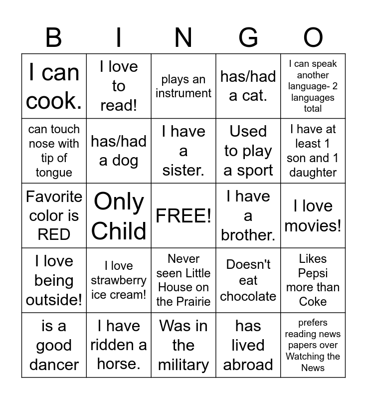 This bingo card has a free space and 24 words: I love strawberry ice cream!, I have ridden a horse., I have a sister., is a good dancer, I can speak another language- 2 languages total, I can cook., can touch nose with tip of tongue, I love to read!, I have a brother., Never seen Little House on the Prairie, Used to play a sport, Favorite color is RED, Doesn't eat chocolate, Likes Pepsi more than Coke, has/had a dog, has lived abroad, I love movies!, plays an instrument, I have at least 1 son and 1 daughter, Only Child, prefers reading news papers over Watching the News, I love being outside!, has/had a cat. and Was in the military.