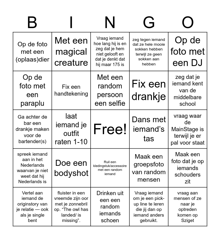 This bingo card has a free space and 25 words: Doe een bodyshot, Drinken uit een een random iemands schoen, Met een random persoon een selfie, Vertel aan iemand de originstory van je relatie — ook als je single bent, Op de foto met een DJ, Op de foto met een (oplaas)dier, Op de foto met een paraplu, Met een magical creature, Dans met iemand’s tas, Ruil een kledingstuk/accessoire met een random iemand, Fix een drankje, Ga achter de bar een drankje maken voor de bartender(s), Maak een groepsfoto van random mensen, Maak een foto dat je op iemands schouders zit, Fix een handtekening, Bestel 3x iets in het Hongaars (minimaal 1 volledige zin), vraag waar de MainStage is terwijl je er pal voor staat, Vraag iemand hoe lang hij is en zeg dat je hem niet gelooft en dat je denkt dat hij maar 175 is, zeg dat je iemand kent van de middelbare school, laat iemand je outfit raten 1-10, vraag aan mensen of ze naar je optreden komen op Sziget, fluister in een vreemde zijn oor met je zonnebril op. “The owl has landed/ is missing”., spreek iemand aan in het Nederlands waarvan je niet weet dat hij Nederlands is, zeg tegen iemand dat ze hele mooie sokken hebben terwijl ze geen sokken aan hebben and Vraag iemand om je een pick-up line te leren die jij dan op iemand anders gebruikt..