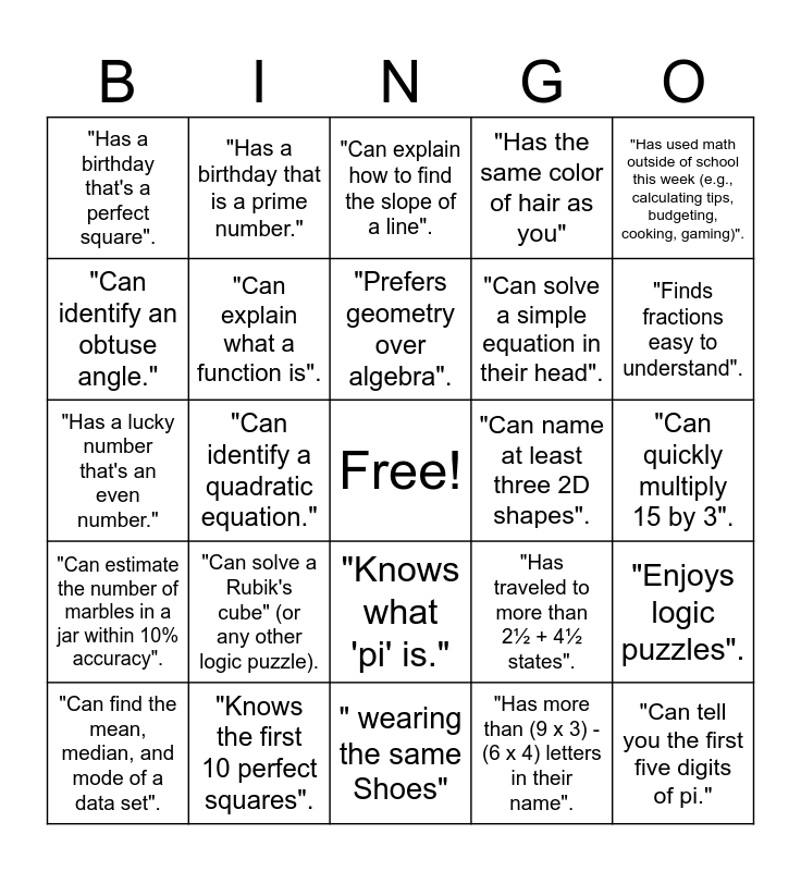 This bingo card has a free space and 24 words: "Can solve a Rubik's cube" (or any other logic puzzle)., "Knows the first 10 perfect squares"., "Prefers geometry over algebra"., "Can find the mean, median, and mode of a data set"., "Has used math outside of school this week (e.g., calculating tips, budgeting, cooking, gaming)"., "Has a birthday that's a perfect square"., "Can identify an obtuse angle.", "Has a birthday that is a prime number.", "Can name at least three 2D shapes"., "Knows what 'pi' is.", "Can solve a simple equation in their head"., "Has a lucky number that's an even number.", "Has traveled to more than 2½ + 4½ states"., "Enjoys logic puzzles"., "Can explain what a function is"., "Has more than (9 x 3) - (6 x 4) letters in their name"., "Can quickly multiply 15 by 3"., "Can explain how to find the slope of a line"., "Finds fractions easy to understand"., "Can identify a quadratic equation.", "Can tell you the first five digits of pi.", "Can estimate the number of marbles in a jar within 10% accuracy"., "Has the same color of hair as you" and " wearing the same Shoes".