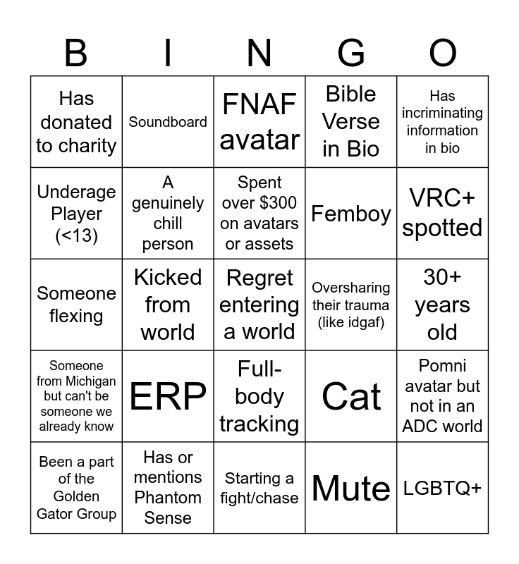 This bingo card has a free space and 24 words: ERP, Has or mentions Phantom Sense, Spent over $300 on avatars or assets, Been a part of the Golden Gator Group, Has incriminating information in bio, Has donated to charity, Underage Player (<13), Soundboard, Oversharing their trauma (like idgaf), Full-body tracking, Femboy, Someone flexing, Cat, Pomni avatar but not in an ADC world, A genuinely chill person, Mute, 30+ years old, FNAF avatar, VRC+ spotted, Kicked from world, LGBTQ+, Someone from Michigan but can't be someone we already know, Bible Verse in Bio and Starting a fight/chase.