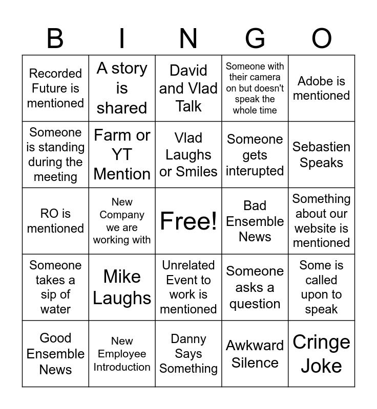 This bingo card has a free space and 24 words: Mike Laughs, New Employee Introduction, Vlad Laughs or Smiles, Good Ensemble News, Adobe is mentioned, Recorded Future is mentioned, Someone is standing during the meeting, A story is shared, Bad Ensemble News, Unrelated Event to work is mentioned, Someone gets interupted, RO is mentioned, Someone asks a question, Some is called upon to speak, Farm or YT Mention, Awkward Silence, Something about our website is mentioned, David and Vlad Talk, Sebastien Speaks, New Company we are working with, Cringe Joke, Someone takes a sip of water, Someone with their camera on but doesn't speak the whole time and Danny Says Something.