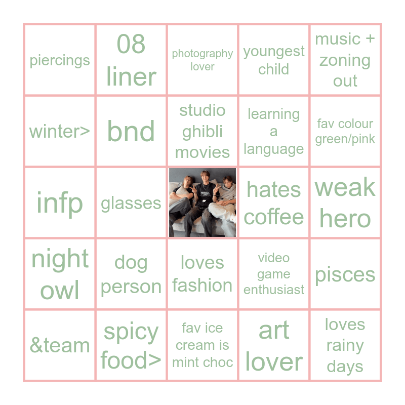 This bingo card has a free space and 24 words: &team, dog person, studio ghibli movies, art lover, music + zoning out, piercings, 08 liner, photography lover, hates coffee, weak hero, infp, bnd, video game enthusiast, pisces, winter>, spicy food>, fav ice cream is mint choc, youngest child, fav colour green/pink, night owl, glasses, loves fashion, learning a language and loves rainy days.